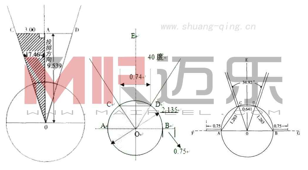 (3) 作与直径相正交的纵轴线OE,在纵轴线10米处取一点F,通过F点作OE的垂线CD,使CF=DF=30.64米。
