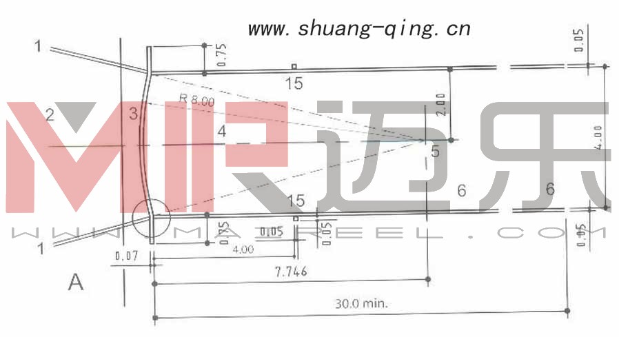 》第187条第9款,助跑道的长度采用m,只超出外突沿弧顶外。这两种距离都不好画线,建议助跑道边线只画至内突沿。