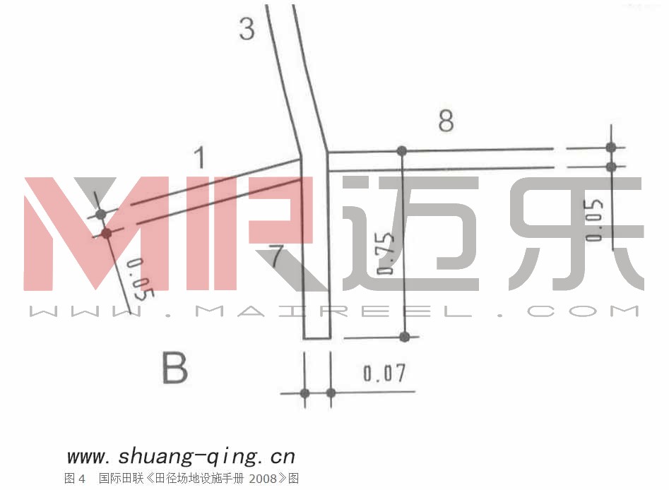 6. 依据国际田联《田径场地设施手册2008》图2.4.3.2,增加了4米点(按《田径竞赛规则2008》图16,为4米线)。(见图1、2)