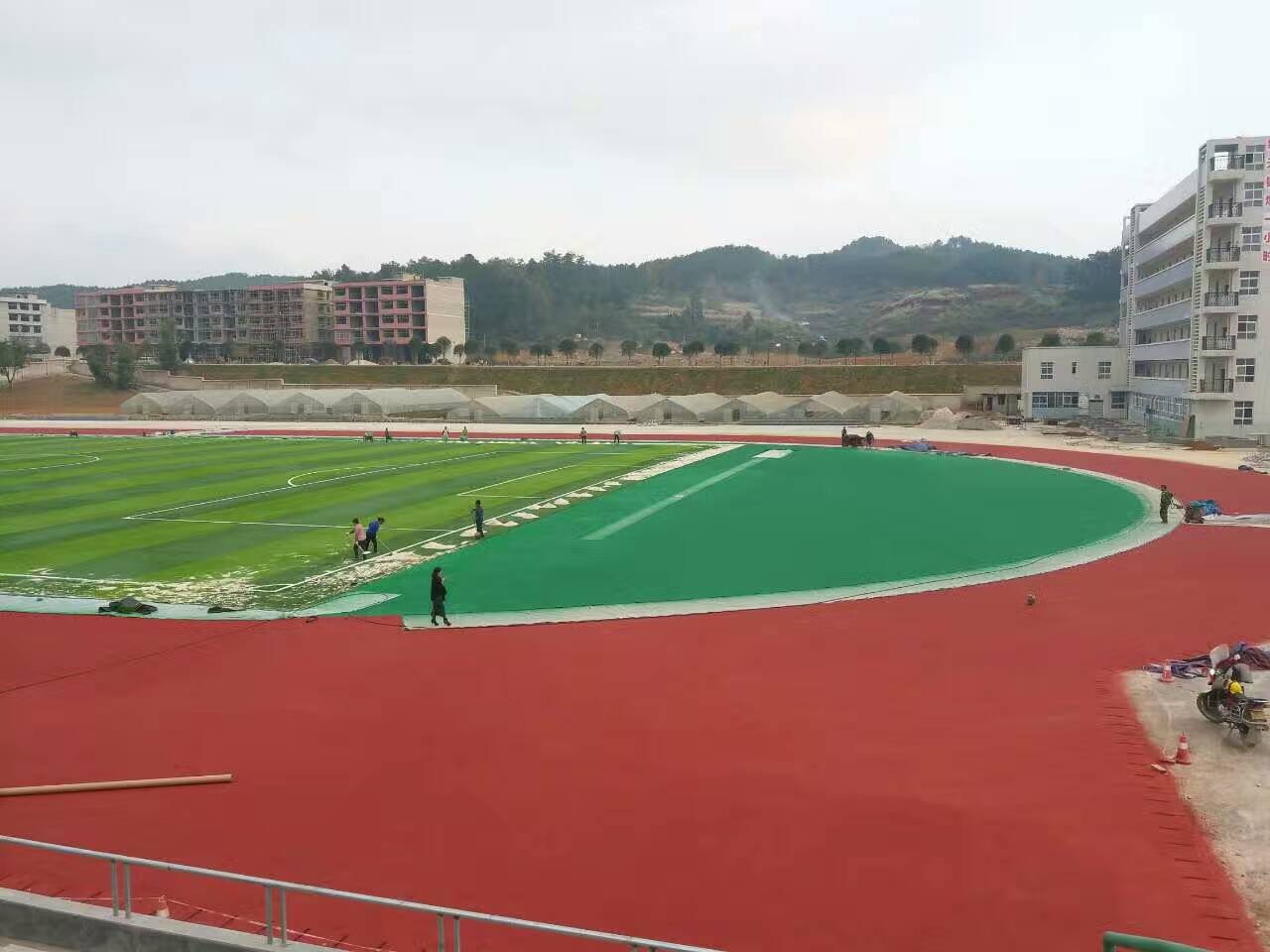 1.按设计要求支模,保证模板的标高、尺寸、厚度和强度、刚度、稳定性。测出塑胶跑道横向坡度0.8%、纵向坡度0.1%。球场按0.3%的倾
