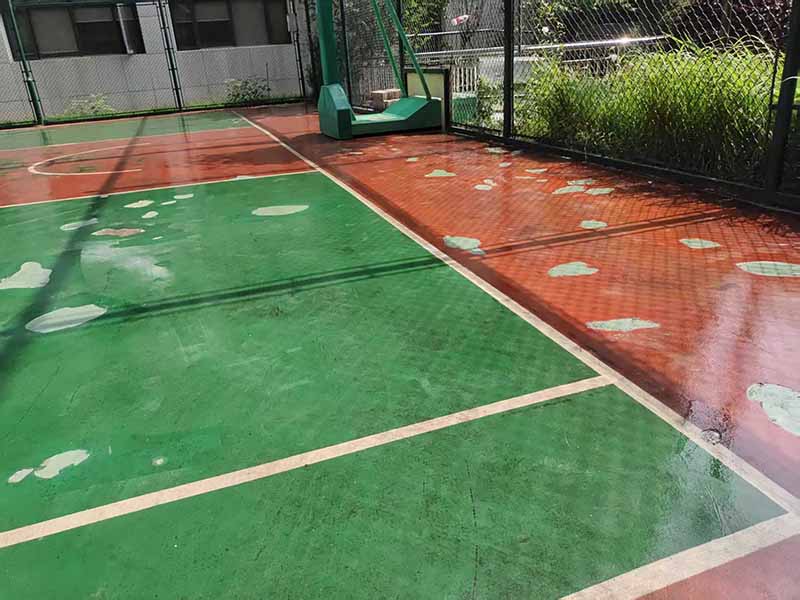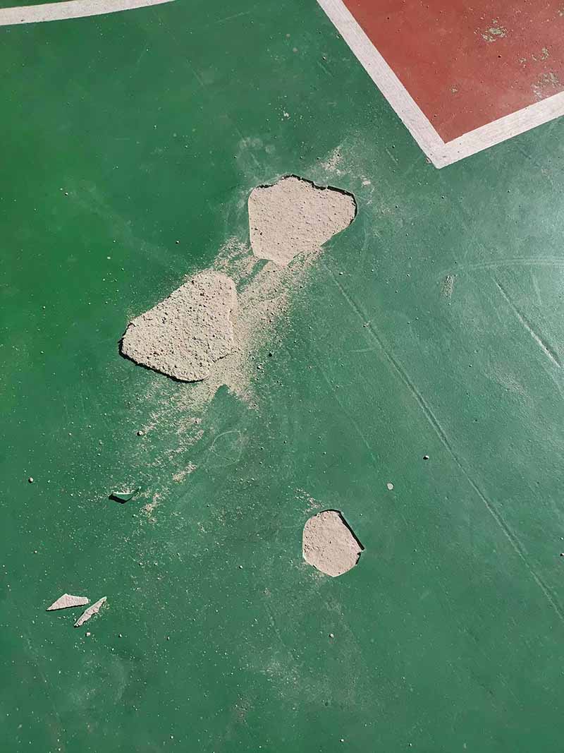 对于老旧的硅PU篮球场,一般都存在问题,此球场就是由于水泥基础做完后,在上面找平了一层水泥,导致水泥脱层,粉化。从而导致硅