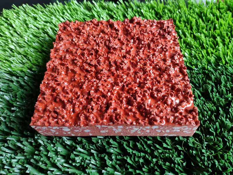 色彩:专用高弹性EPDM和PU颗粒(通常也称聚氨酯颗粒),表面颜色柔和,颗粒状表层,防止刺眼光线的反射,美观耐久,并可采用多色彩搭配,聚合氢元素及硫化过程
