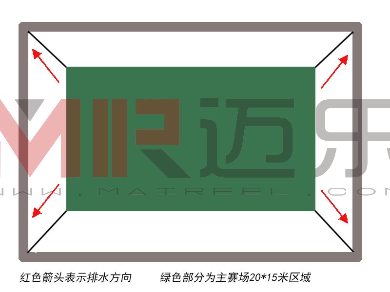 另一种设计方案是主赛场20*15米的300平方米区域内做成全水平面,在300平方以外的区域放坡3--5‰,这样做的好处是保证了主赛场的平