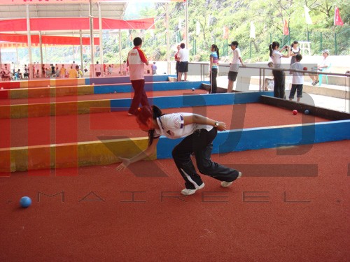 (2)滚球场为排水良好的硬土碎石地(4米*15米),硬土表面上需铺碎石(直径约0.1-1厘米),厚度约3厘米,必须牢实,类似红土跑道般