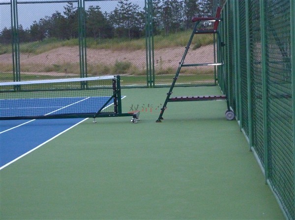 ⒃ 划线: 用丙烯酸白线漆画标准网球场界线一道按国际标准测量, 用进口贴胶纸机将胶纸按线紧粘在地面上, 防止毛边, 用刷子直接刷涂料一层。