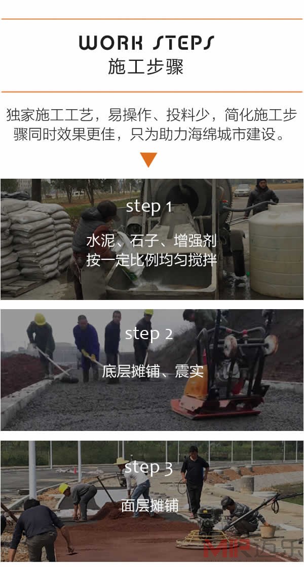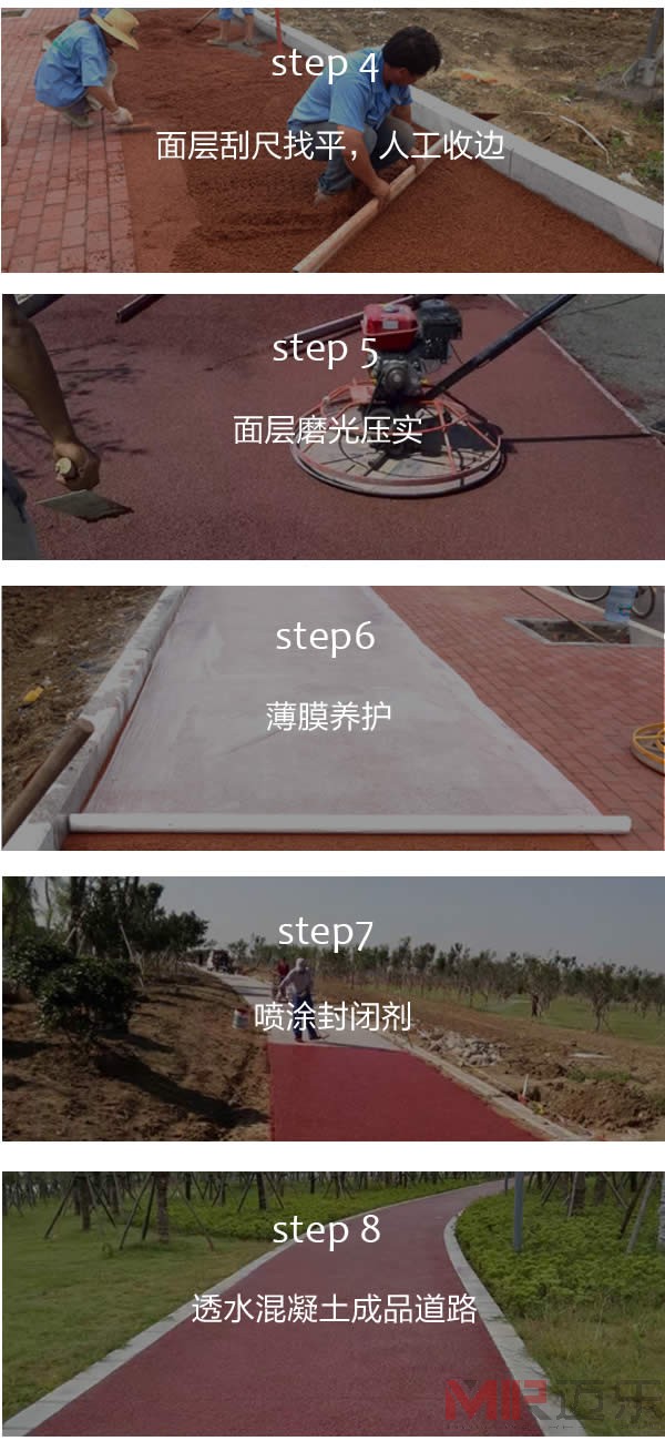 透水地坪做法:【搅拌】【浇筑】【振捣】【辊压】【养护】【成品】