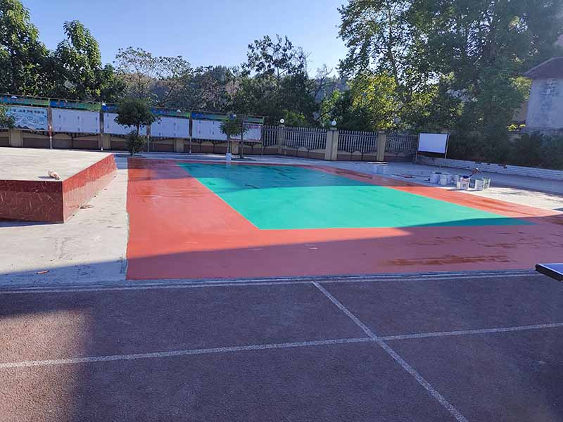 首先对基础水泥渣清除,然后滚涂水泥封闭底涂。待底涂固化后,刮涂第一遍硅PU球场材料。
