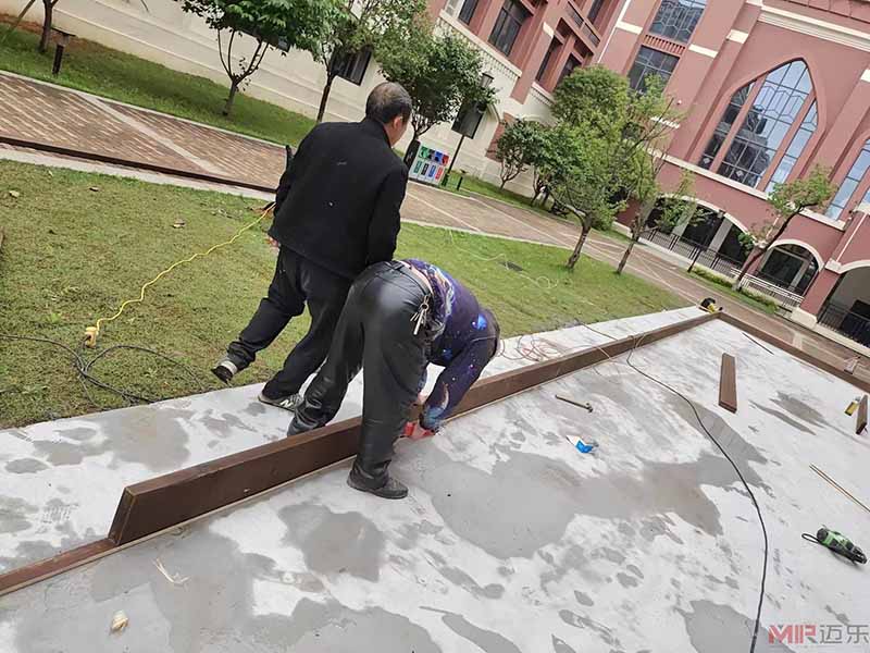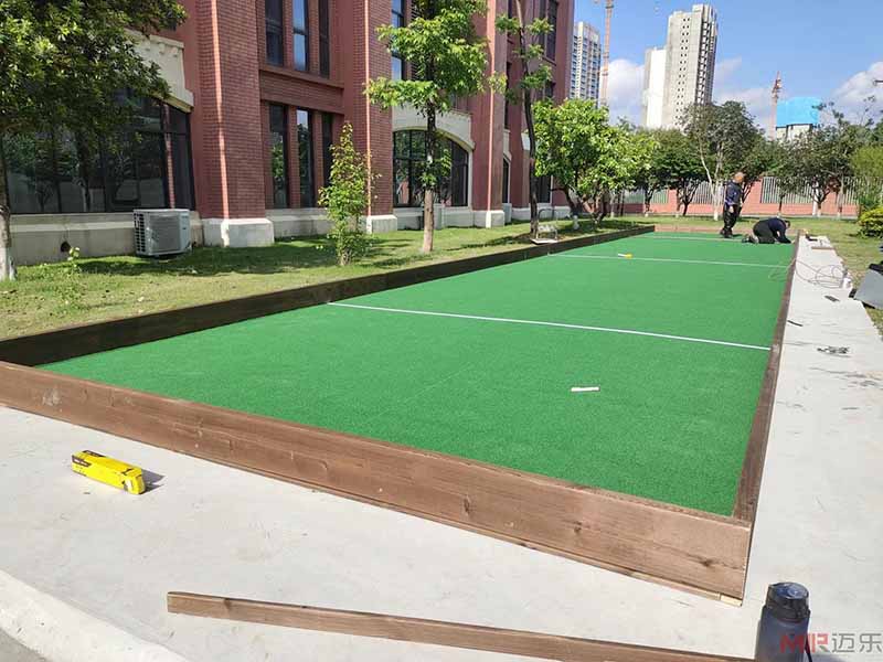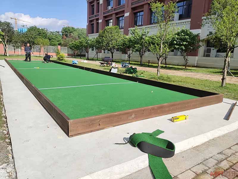 弹线后,确定人造草坪滚球场的尺寸范围,在四周安装防腐木挡板。
