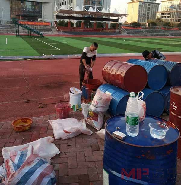 本塑胶跑道施工所用材料为混合型塑胶跑道PU组合胶(甲组和乙组分按照一定比例配比搅拌据匀后摊铺刮涂)、塑胶跑道喷面胶+EPDM喷面