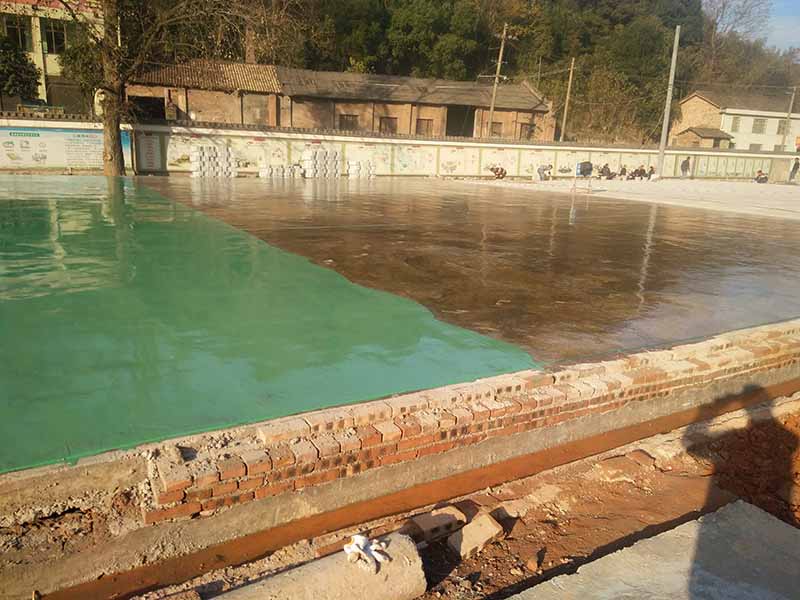 采用5mm硅pu球场材料铺装,基础为水泥基础,由于是冬天,而且是新浇筑水泥基础,一个月养护期后,底层湿气难以排除。