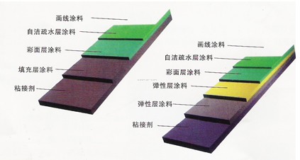 施工流程:基础处理(清扫)→底涂层→中涂层→纹理层→面层→划线