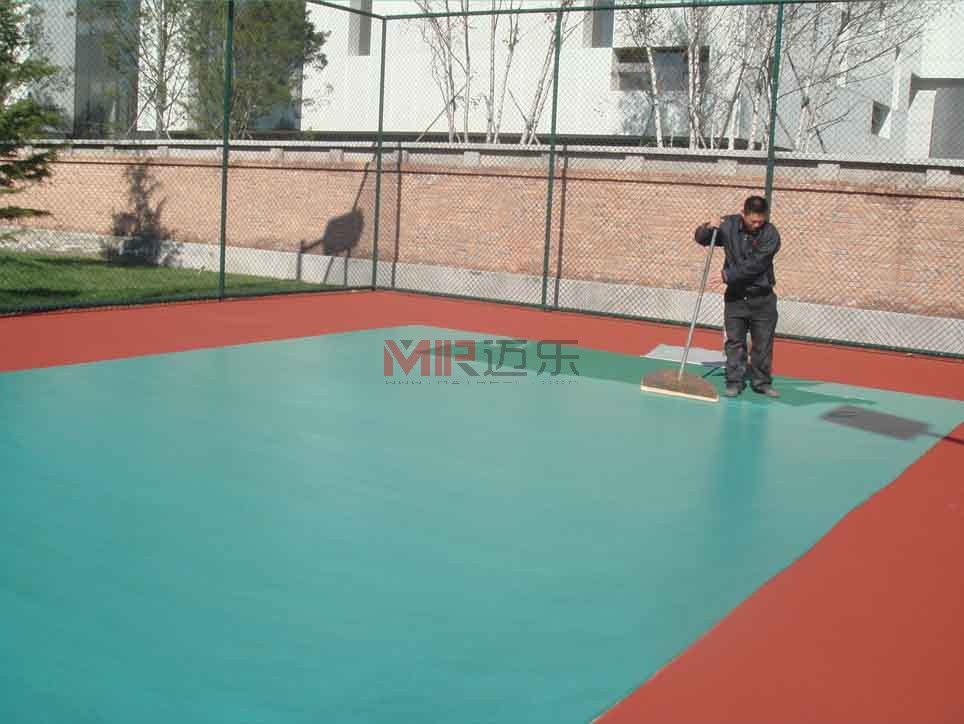 (3)弹性层:用丙烯酸粗弹性层涂料兑水充分搅拌后用橡胶刮耙全场刮涂两遍,增加球场弹性。待16小时干透后用丙烯酸细弹性层涂料
