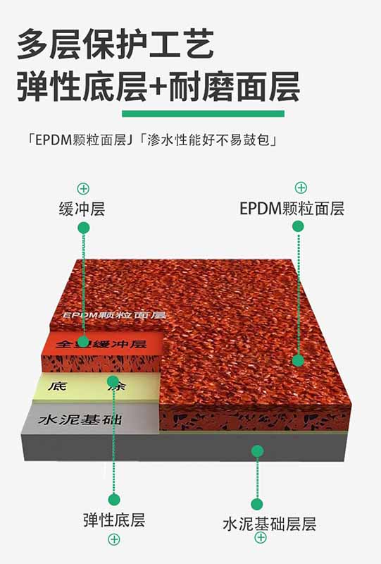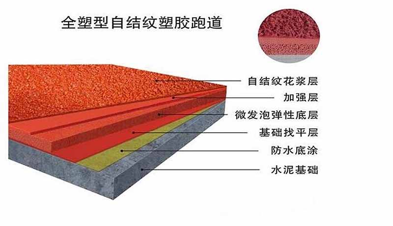 全塑型塑胶跑道是一种新型底层无颗粒的塑胶跑道材料,是严格依照德国DIN18032标准设计的,面层是EPDM颗粒+跑道面漆