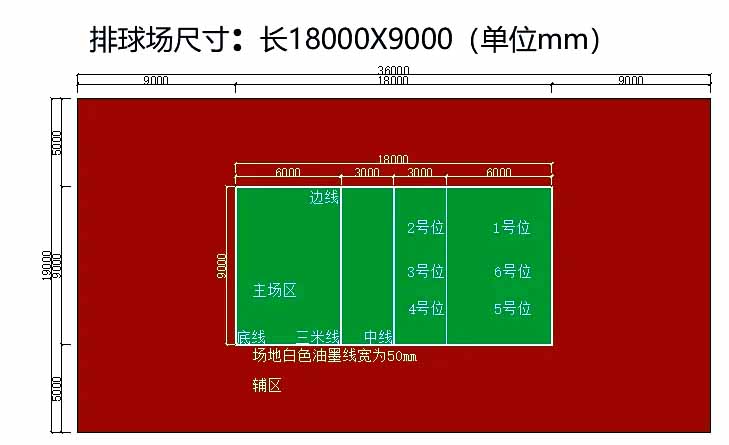 排球场包括比赛场区和无障碍区。依照国际篮联规定,其尺寸为长方形,比赛场区为长18米,宽9米的长方形,其四周至少有3米宽呈长方形对称的无障碍区,以确保比赛的安全与顺利进行。从地面量起至少有7米的无障碍空间,以确保球员的空中动作不受限制。对于国际排联举办的全球性赛事,无障碍区的要求更为严格,硅PU排球场区边线外的障碍区至少5米,端线后至少9米,上空的无障碍空间至少12.5米。