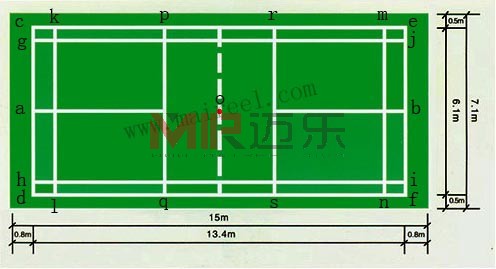 宽5.18米,场地对角线长14.366米;双打场地长13.40米,宽6.10米,场地对角线长14.723米。标准尺寸的羽毛球场地线和羽毛