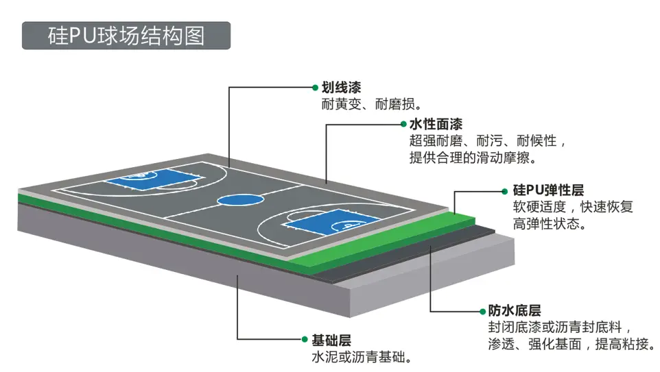 硅pu篮球场主要由基础(水泥/沥青混凝土)+底涂+弹性层+加强层+面漆+画线构成。